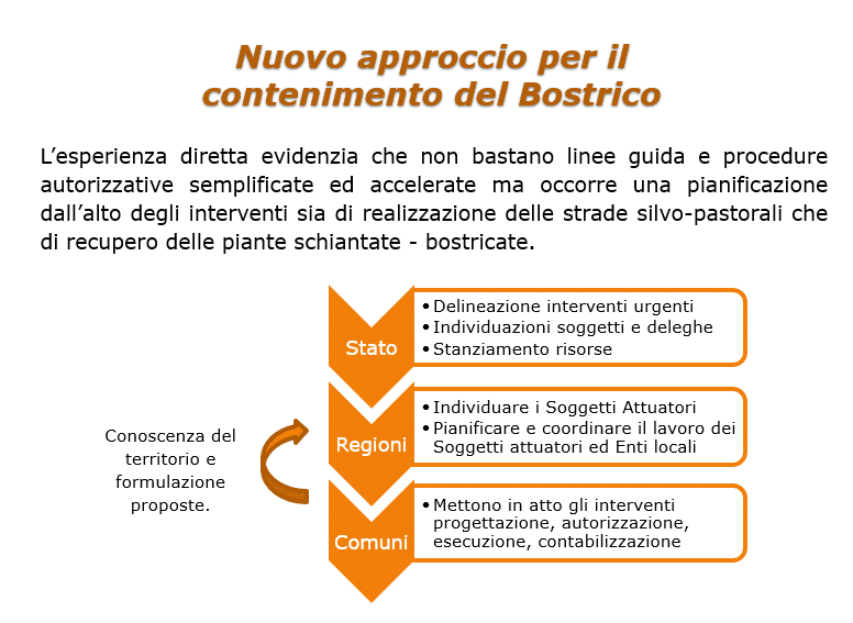 Federico Correale Santacroce di Veneto Agricoltura ha proposto il tema “Esperienze di contrasto alla diffusione del bostrico: gli interventi pilota nelle Foreste Demaniali Regionali gestite da Veneto Agricoltura”. Si è focalizzato su due realtà: gli interventi nelle FDR di Pian Cansiglio (BL) e di Giazza (VR). In Pian Cansiglio la tempesta Vaia ha interessato buona parte della foresta con diversa gradazione di danno. L’infestazione si è palesata su piccoli nuclei e le piante colpite sono state abbattute e allontanate a cura delle stesse imprese già operanti sui lotti Vaia. A Giazza si sta applicando invece il metodo Push and Pull: vengono monitorate due aree in cui sono state inserite delle trappole a feromoni e a fine stagione dei repellenti. Durante le visite di controllo i valori sono al di sotto delle soglie usualmente considerate. “É, comunque, difficile trarre conclusioni sull’efficacia relativa del metodo push and pull impiegato, discriminando l’effetto dai fattori naturali che insistono sulla dinamica della popolazione di Ips tipographus”. Il tema invece del “Bostrico e la frammentazione della proprietà forestale” è stato trattato dal dott. for. Luca Canzan che ha evidenziato come “il Bostrico, oltre all’innesco provocato dagli schianti della tempesta Vaia, è stato fortemente incentivato dalla frammentazione della proprietà privata e dallo stato di abbandono generale, nonché dalla mancanza di norme che tutelino il lavoro dei Sindaci e dei Soggetti Attuatori”. A prova di ciò Canzan cita e spiega la Legge di Bilancio e Previsione n° 234/2021. Proseguendo con delle considerazioni sull’esperienza diretta, arriva alla conclusione che non bastano linee guida e procedure autorizzative semplificate ed accelerate, ma occorre una pianificazione dall’alto degli interventi, sia di realizzazione delle strade silvo-pastorali che di recupero delle piante schiantate-bostricate.