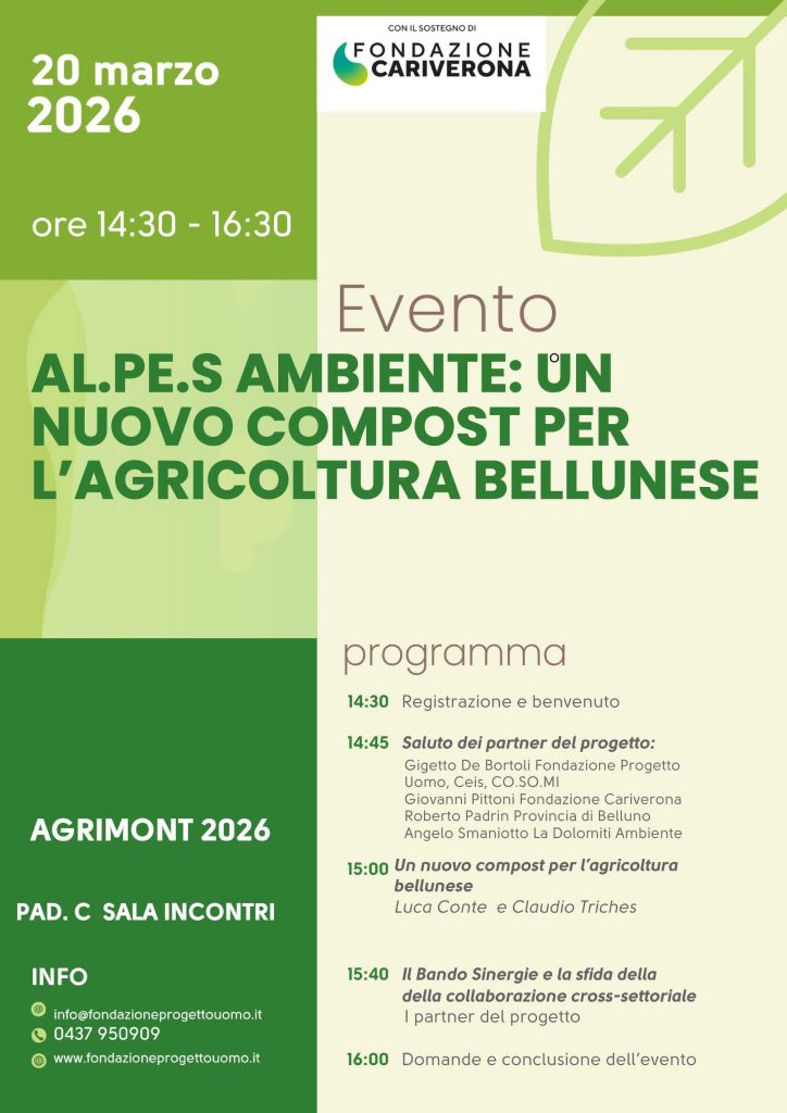 Trasformare residui organici e biomasse locali in una risorsa per l’agricoltura anche biologica. È questo l’obiettivo del progetto Al.Pe.S Ambiente, i cui risultati saranno presentati venerdì 20 marzo 2026 ad Agrimont, presso Longarone Fiere (Padiglione C – Sala incontri), nel corso dell’evento “Progetto Al.Pe.S Ambiente. Un nuovo compost per l’agricoltura bellunese” dedicato al tema della gestione sostenibile delle risorse organiche in ambito montano.