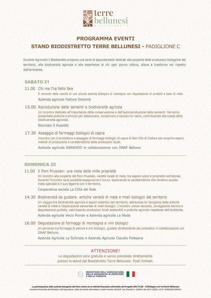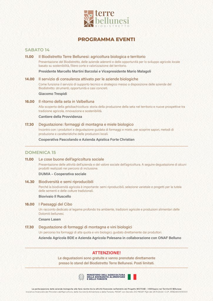 Nel corso del primo fine settimana della manifestazione il Biodistretto proporrà un programma di appuntamenti aperti al pubblico con presentazioni, testimonianze e degustazioni guidate. Sarà l’occasione per conoscere da vicino alcune realtà produttive del territorio, approfondire temi come biodiversità, agricoltura sociale, consulenza alle aziende biologiche e riscoperta di filiere tradizionali, e assaggiare prodotti che raccontano la ricchezza agricola delle Dolomiti bellunesi.